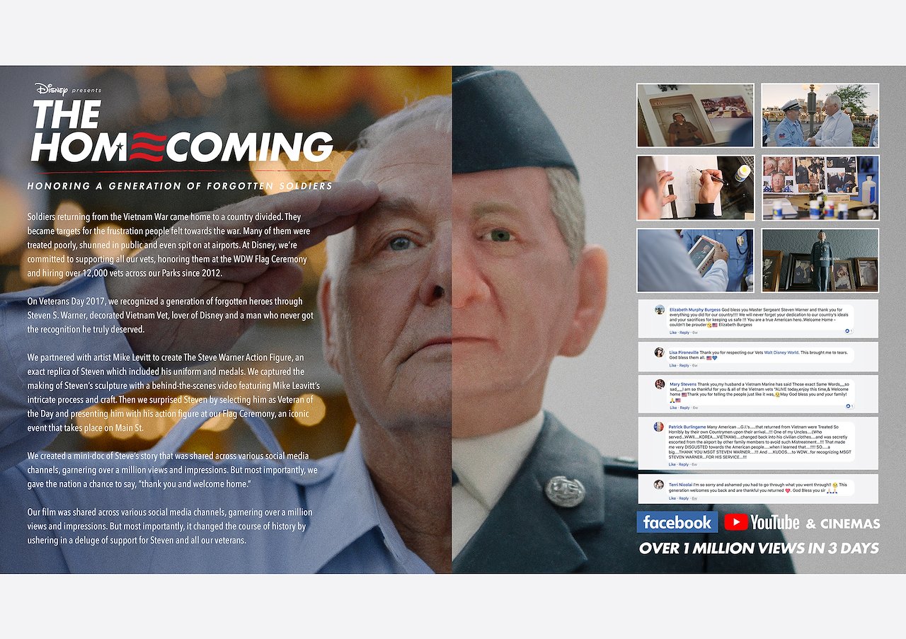 We worked with director John X. Carey to create a short documentary of Steve’s story. It was shared across various social channels, garnering over a million views and impressions. It also ushered in a slew of support and encouragement for Steve, a man who finally got the homecoming he needed, years after the war.